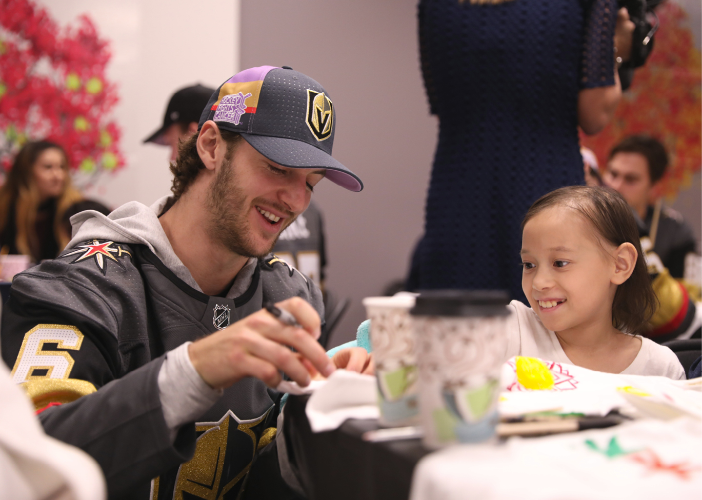 Vegas Golden Knights defenceman Colin Miller representing NHL’s Hockey Fights Cancer with a young cancer patient