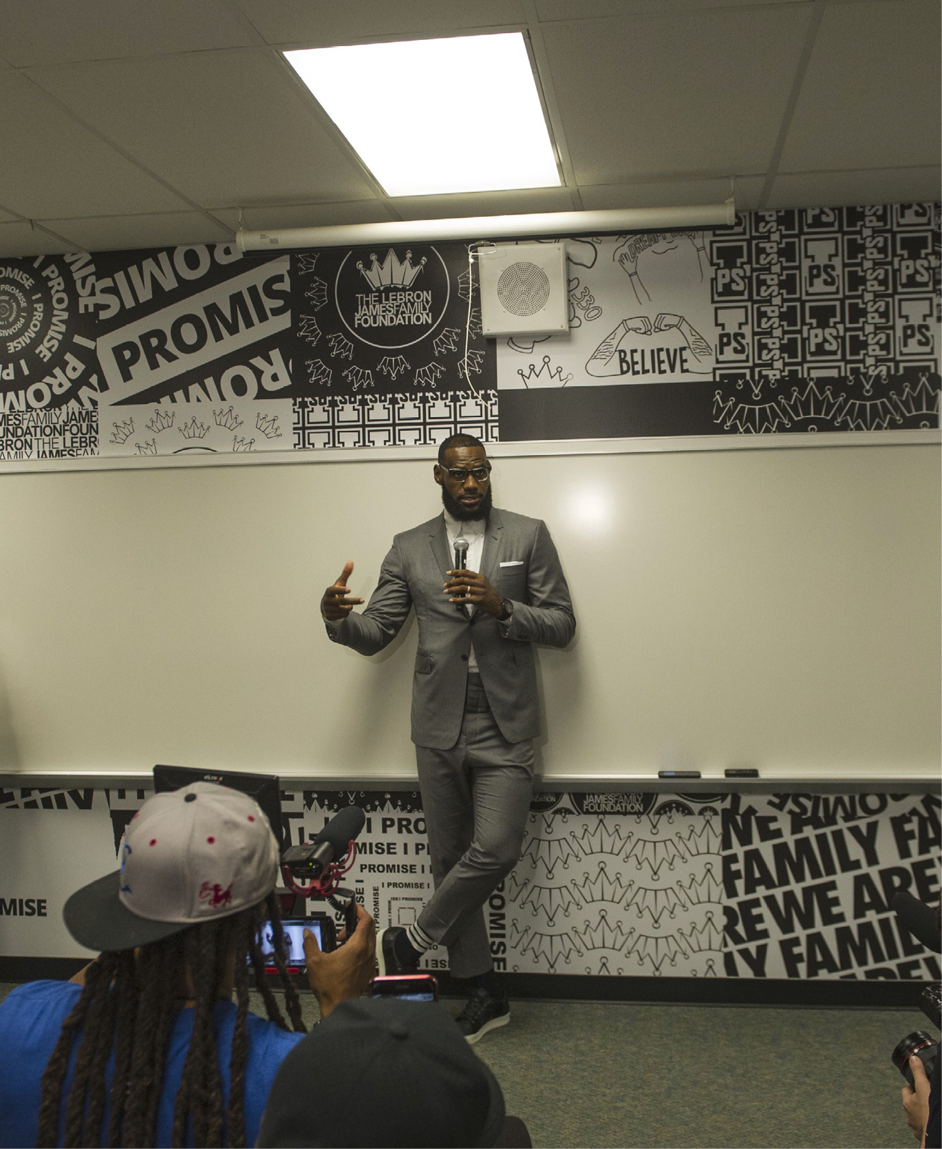 LeBron James addresses the media at the opening of the I Promise School in Akron, Ohio