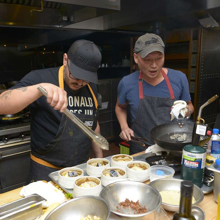 Inside Sparrow + Wolf, the night’s competing chefs, Shaun King of Momofuku and Ricardo Heredia of China Poblano, each grabbed their sous chefs and waited for the unveiling of the mandatory ingredients. Says Mannina of how ingredients are chosen, “It’s gotta be an item that can be cooked within 30 minutes, but it also can’t be an item that can be cooked too fast because there will be a lapse in time. It also has to be items that are challenging but still you can have a thought process with. At the end of the day I want the chefs to be successful.”