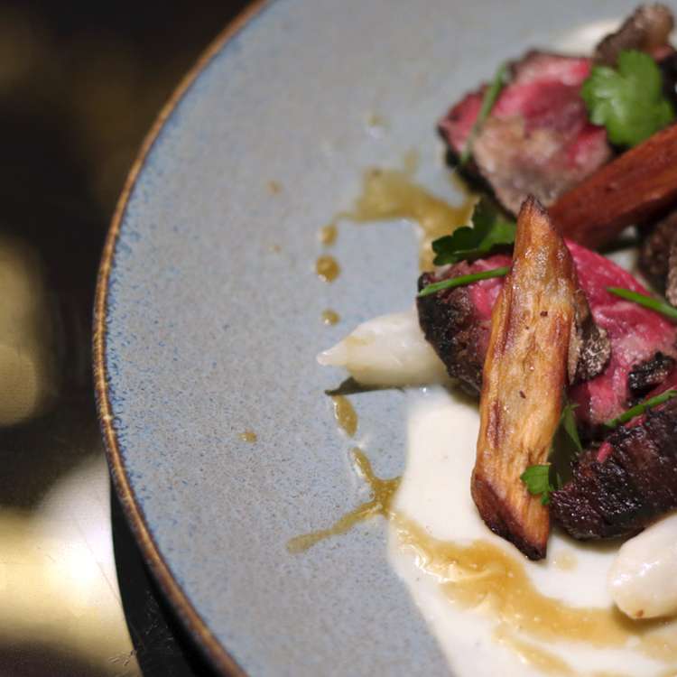 Course four was the course of the night. Here McClain worked his meaty magic on Snake River Farms American Wagyu ribeye cap. This meat, says McClain, is a, “great meat for a tasting menu. It’s super intense in small doses. 3 or 4 ounces, I think, is just a great amount of that meat.” White miso and salsify puree was paired with a cooked salsify that was poached in chicken stock and aromatics, brined and fried. A veal reduction, black truffle, and fermented wasabi, all added complimentary elements to the stunning beef, which was seared hard, giving it a crunchy exterior but a perfectly rare interior. It was a stunner and still has me wondering how McClain figured out how to harmonize all those seemingly at odds components.