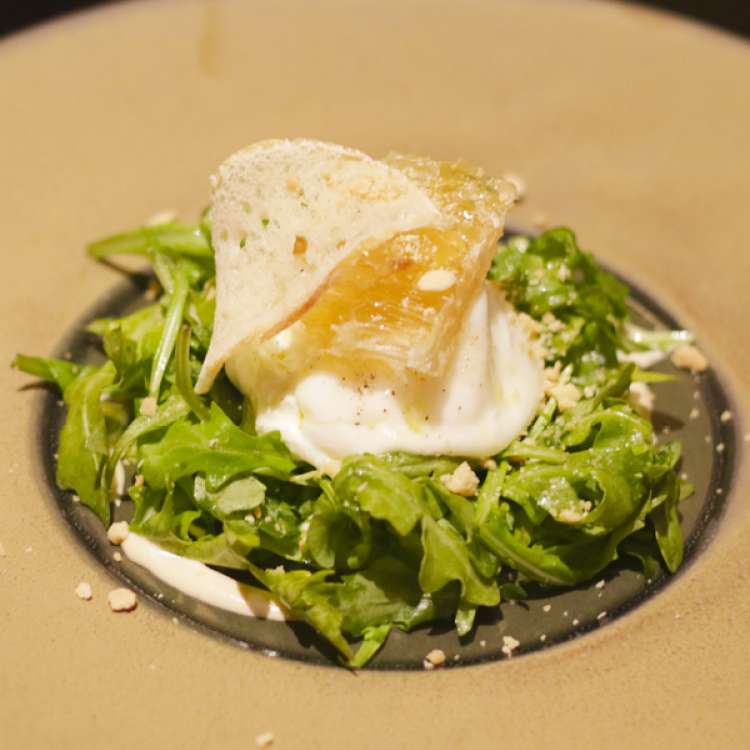 Elliot presented a milk and honey salad as the first course, featuring arugula, stretchy burrata cheese, honeycomb, shaved marcona almonds on top and a marcona almond puree below.