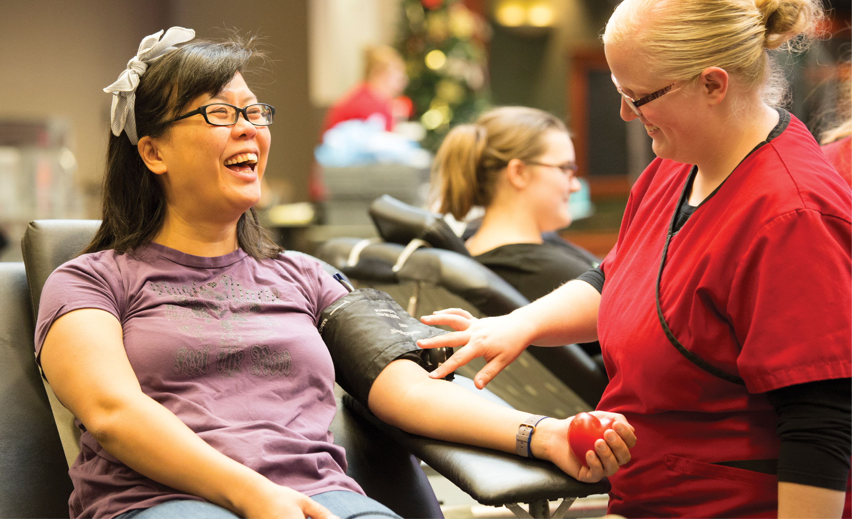 American Red Cross staff member Kathryn Anderson prepares to take a blood donation from Ellie Cheung.