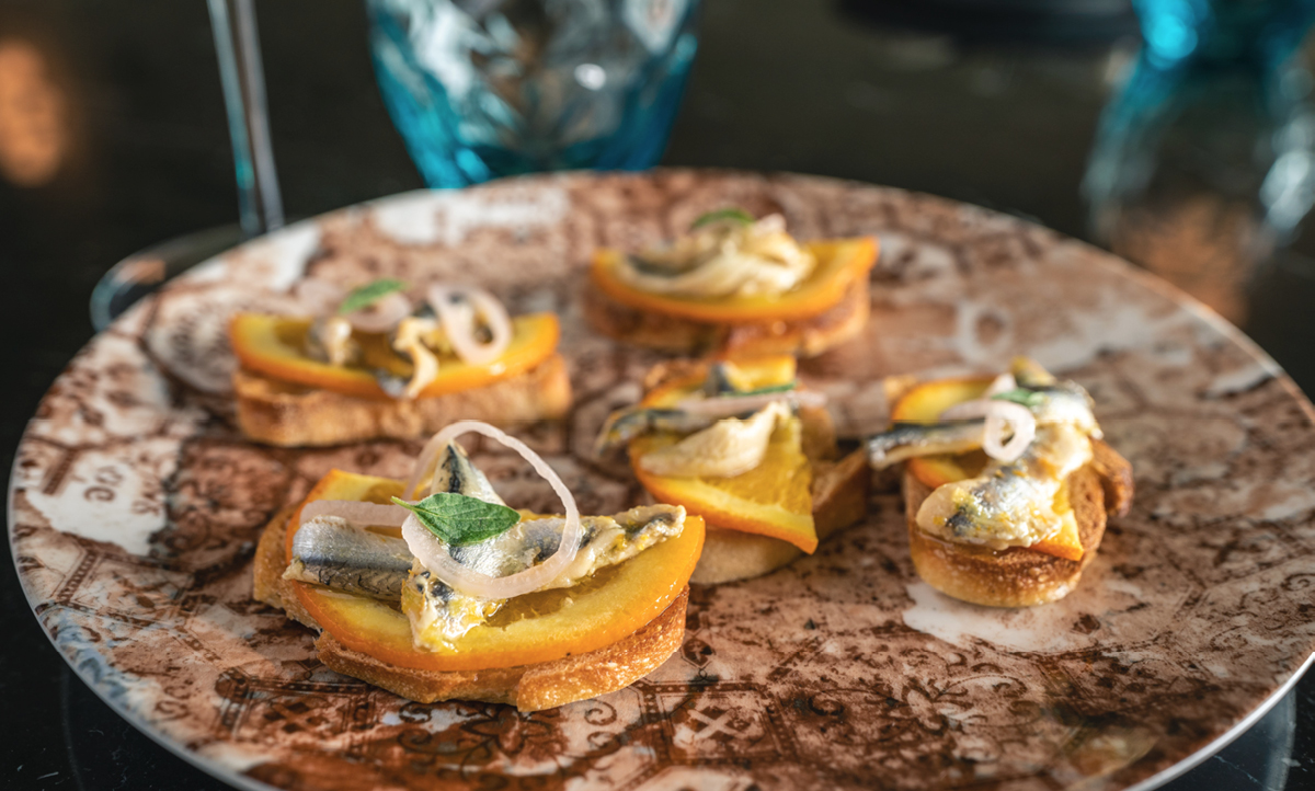 Back to those oceanic walls inside the restaurant. Marinelli loves the Amalfi Coast and sites it as the region she most associates her food with. Take the anchovy crostinis, for example. The fish sits on top of a crunchy piece of bread and is hit with preserved orange, pickled shallots, and oregano. The sweetness of the citrus, along with the acidity of both the orange and the shallots, make the anchovy, an ingredient many find too strong for their taste buds, easier to handle. Think of it as an anchovy starter kit. Marinelli states of the dish, “I think it’s a nice, soft approach to get people to like anchovies and that’s how I always ate in Italy - anchovies and prosecco.”