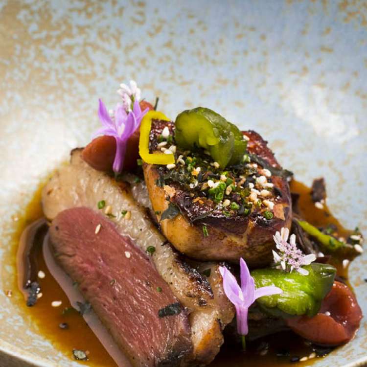 That was a dish that was on the fly. We were prepping for a New Year’s Eve party at a friend’s house. I went to the market, grabbed some ingredients, and went home and started making this tomato and seaweed stew with bacon. I had learned a gratinee technique where we take hollandaise, mornay sauce, and whipped cream and fold it into crab and bake it. We made a clam mornay and introduced that to the ragout of seaweed and tomato and bacon and ginger. We fold the clams in a la minute. It’s this new age clams casino in a sense. I thought it really paid homage to Las Vegas in a sense. It holds a reference to something old or classic but done in a new way.