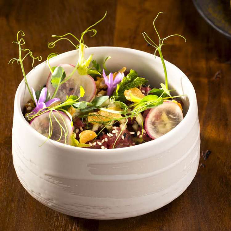 Start with the lamb ($13) in the raw section. The tartare is prepared with unique flavors. Of his inspiration, the chef explains, “It’s typical of lamb kabob in India. but we’re doing it with a raw preparation.” Toasted sesame, apple, and walnut round the flavor profile out, but the real star here might be the bhatura that accompanies the protein. It’s a leavened, fried Northern Indian bread that is both a delightful vessel for the lamb and equally as delicious on its own.