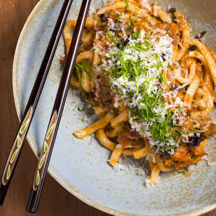 Udon ($16) with lamb bolognese, Taggiasche olives & mint is pepper forward and another example of Howard’s multicultural cooking.