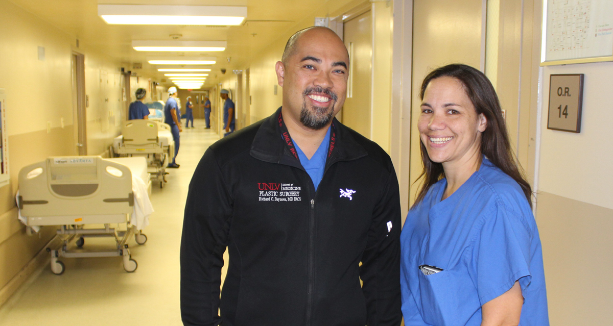 The Baynosas, who married in 2008, met while completing surgical residencies at the University of Nevada, Reno School of Medicine. He also trained in Belgium with world-renowned plastic surgeon Dr. Phillip Blondeel, the originator of DIEP free flap reconstruction, a complex procedure that involves taking a section of tissue from one area of a woman’s body – most often her abdomen – and relocating it to create a new breast mound. Baynosa became the first surgeon in the state of Nevada to offer DIEP reconstruction and, in his role as an associate professor at the UNLV School of Medicine, has since trained several residents in the technique.