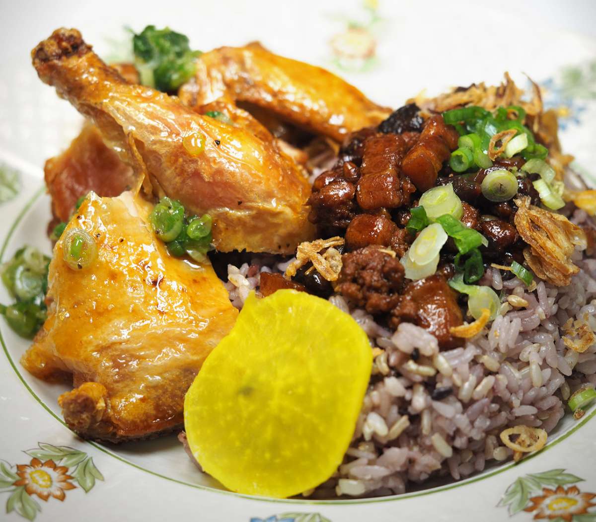 Crispy skin spring chicken ginger scallion + Lu Rou Fan. Photo by Ginger Bruner.